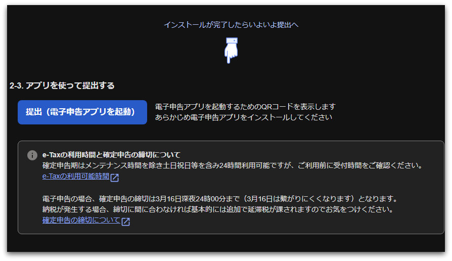 マイナポータルやら専用アプリのインストール、設定を終えると、上記画像のように、『提出(電子申告アプリを起動)』のボタンがあり、ここを押すとQRコードが表示されます。