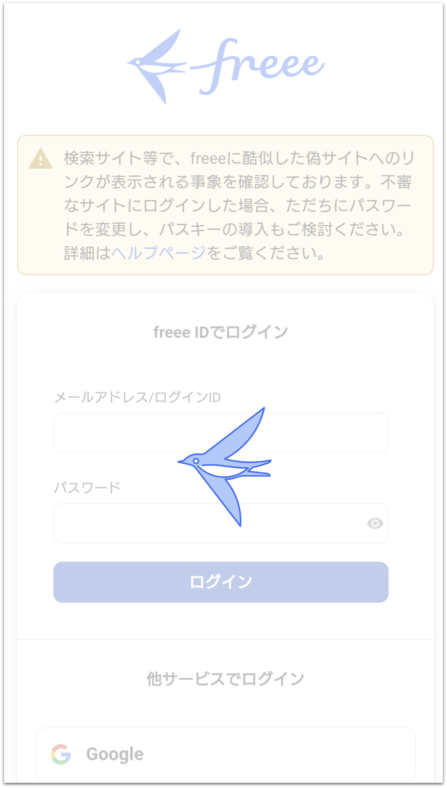 しかし、ここでメールアドレスやパスワードを打ち込んでも、この鳥が出てきてうんともすんとも言わなくなりログイン出来ません!